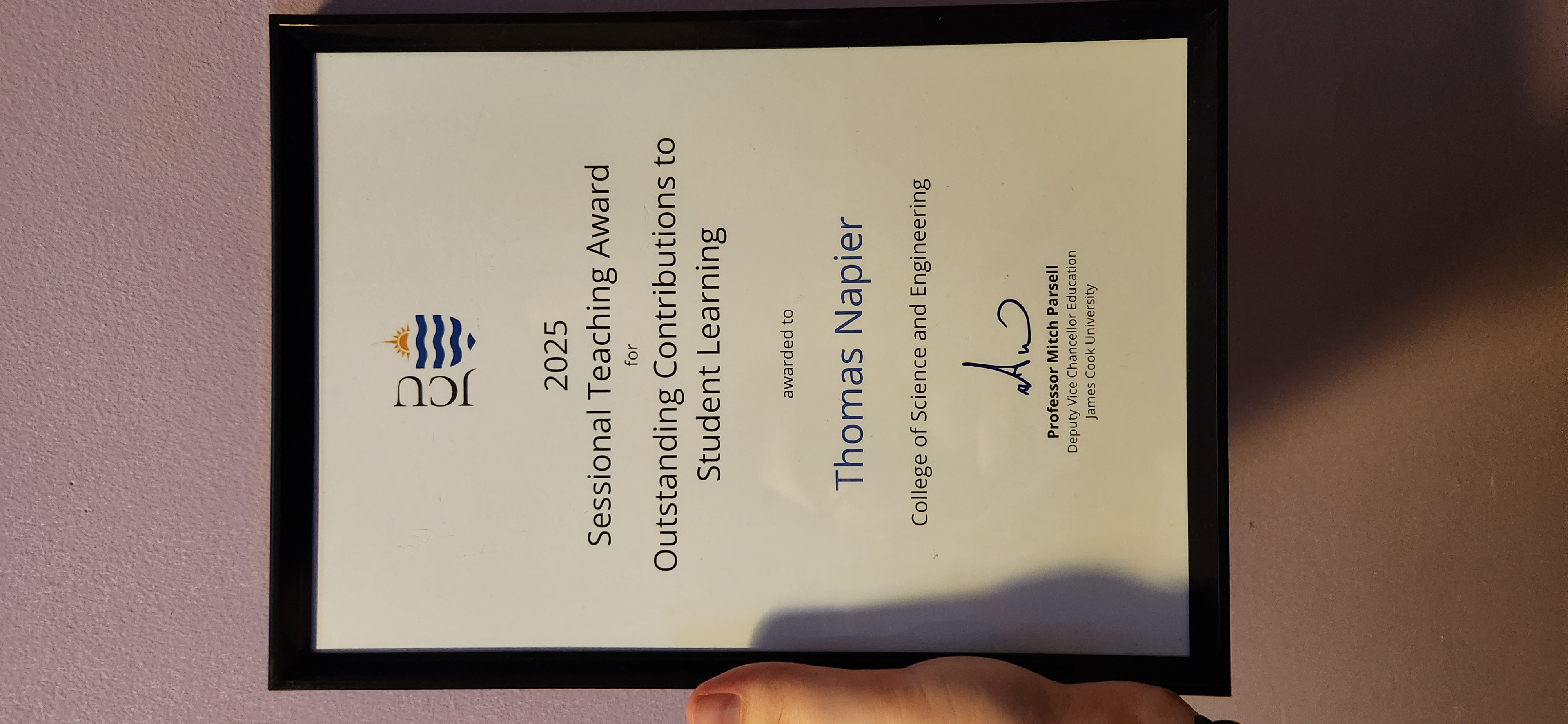 - September, 2025: I was pleased to accept 1 of 5 Sessional Teaching Awards for Outstanding Contributions to Student Learning at the Celebrating Excellence in Learning & Teaching at JCU: Teaching Excellence Awards ceremony.